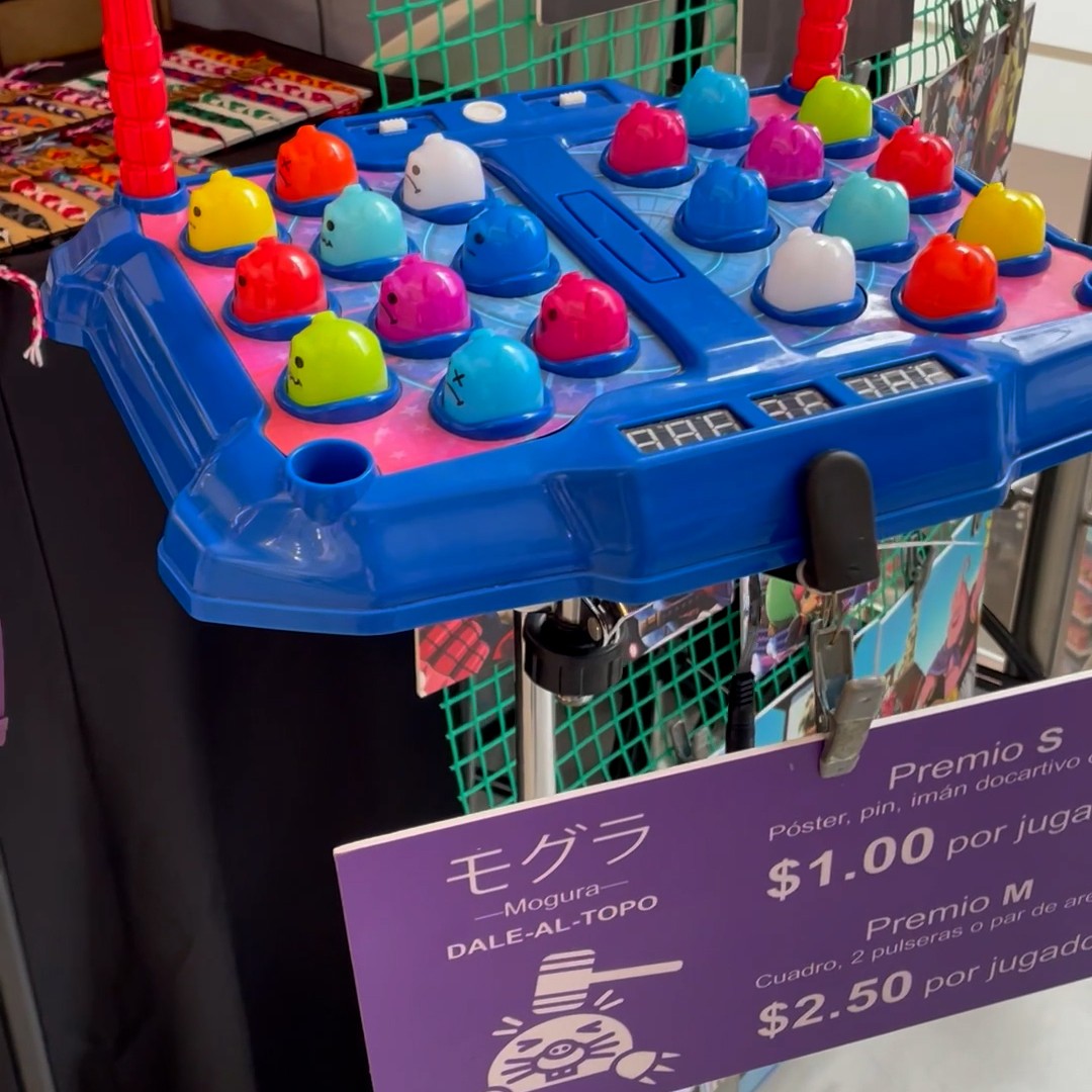 Dos contrincantes tienen un minuto para golpear tantos topos como puedan. Quien logre más aciertos, se lleva el premio.
